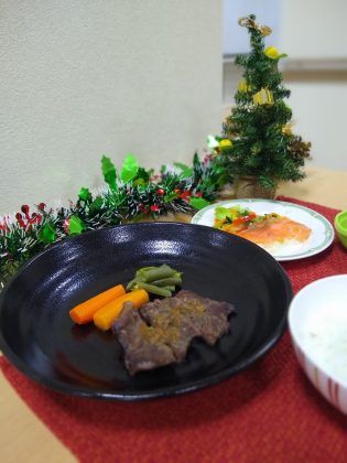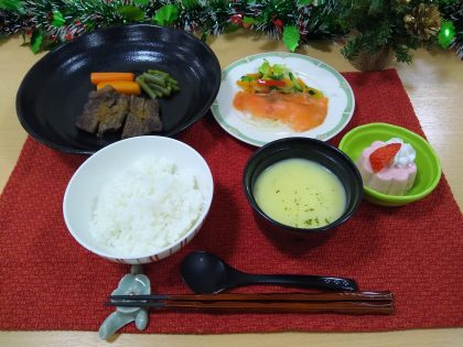 クリスマスディナー🍴~サンヒルズ八景1番館~ 2021/12/31 クリスマス行事の時に提供された、クリスマスディナーです。 国産牛ステーキ・サーモンマリネ・ポタージュスープ・苺のババロアの洋風メニューを 厨房で調理して提供させていただきました。 関連記事