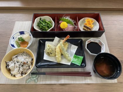 2/16 お楽しみメニュー 2026/02/18 2月のお楽しみメニューは ・梅ひじきご飯 ・さしみ(ぶり、マグロ) ・天ぷら ・炊き合わせ ・菜の花のからしあえ ・すまし汁 ・オレンジケーキ でした。ぶりや菜の花など、旬の食材を味わっていただけるメニューにしました。 皆様に少しでも季節を感じて頂ければと思います。 関連記事