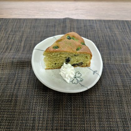 今月のスイーツは黒豆を使ったパウンドケーキです。黒豆と相性の良い抹茶を生地に練りこみました。